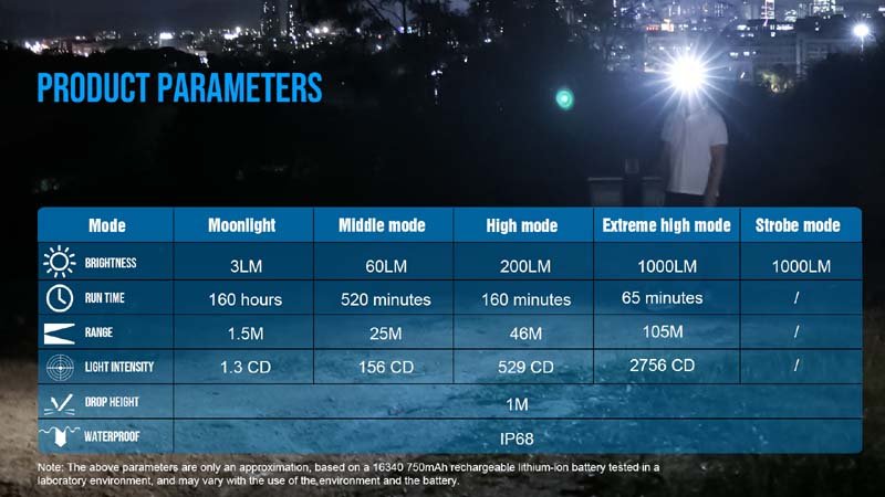- Modes: moonlight>middle mode>high mode>extreme high mode >strobe mode