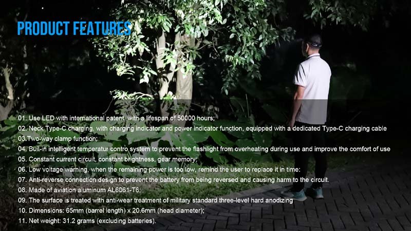 - Accessories: MT15, manual, type-c rechargeable cable, battery, clip, holster, Key ring, lanyard, O-ring